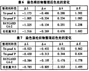 在最佳整理剂用量及焙烘温度下,分别对活性染料染色的棉织物和分散染料染色的涤纶织物进行整理,测定整理前后的色光变化。见表6、表7。