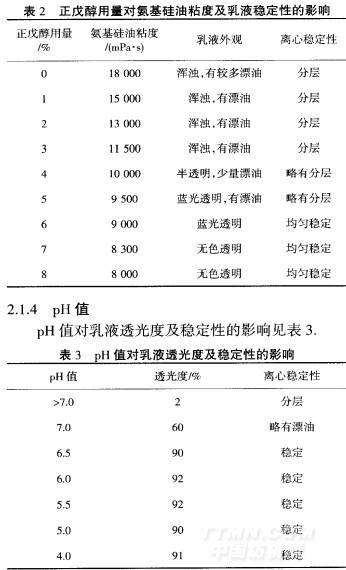 由表3可见,当体系pH值>7.0时,透光度很低,只能形成不稳定的白色乳液,且离心稳定性较差.而体系pH值降到7.0以下时,透光度迅速增加,且能形成稳定的微乳液.研究发现,酸可中和硅油中的氨基,形成带正电荷的双电层,使乳液粒子之问产生斥力,从而使乳液微粒难以接近、聚合,有利于微乳液的形成.但酸性不宜过强,否则应用时会损伤织物.所以,氨基硅油微乳液pH值控制在5.5~6.0即可.