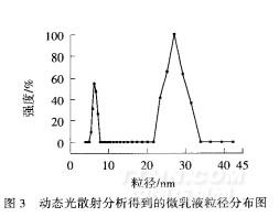 由图3可见,粒径分布图出现了2个峰,且粒径范围都是在50 nm之内,与图2结果相对应.另外,在此微乳液中,低位峰所对应的粒子数目和体积占主导地位.