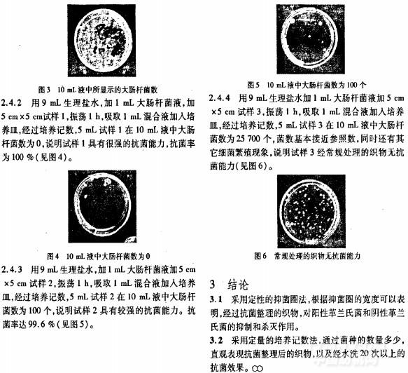 含大肠杆菌的液体,分别取布样各5cm×5cm剪碎,用经过灭菌处理的镊子,将布样分别投入试管中振荡1h,同时取细菌培养皿加入10 mL,温度约37℃的琼脂(不能振荡,防止有气泡产生影响观察效果),各取1 mL振荡液加入器皿,缓慢摇动使液体与琼脂交融,置37℃恒温箱24—48h,取出观察细菌繁殖情况。为了清楚记数,一般按上述操作法再加入两次振荡液,将两次稀释后的振荡液吸取lmL,加入9mL生理盐水,用10 mL液进行培养记数,反推至10mL振荡液所含细菌数。