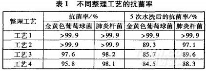 分别采用 1 .2节工艺 1~ 4对染色后的丝光棉纱线(灰色) 进行抗菌整理, 测定整理后及水洗后纱线的抗菌效果 , 结果见表 1 。