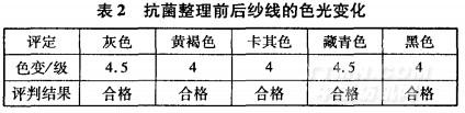 从表 2可知 ,抗菌整理后的纱线色光未发生明显变化,表明抗菌整理对色光无影响。