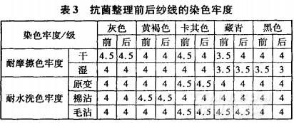 测定抗菌整理前后纱线的耐摩擦色牢度和耐水洗色牢度, 结果见表 3 。