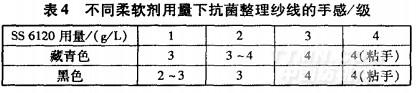 将抗菌整理后的色纱与常规丝光棉纱线进行对比,结果表明,抗菌整理后纱线的手感较硬、较涩,这主要是由于抗菌剂 B D 3 S优先吸附于纱线表面, 阻碍了纱线对柔软剂的吸附; 同时由于抗菌剂 B D 3 S烘干时会形成固化薄膜, 造成纱线发硬。 为了改善纱线手感, 改变改性氨基硅油类柔软剂( S S 6 1 2 0 ) 用量 , 按工艺 1进行整理 , 测定整理后纱线的手感 , 结果见表 4 。