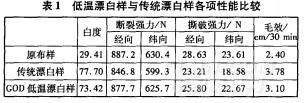 取未精练的退浆纯棉机织布,采用上述优化的葡萄糖氧化酶(GOD)低温漂白工艺处方对其进行漂白,测试试样的各项性能,并与传统漂白样进行比较,结果如表1所示。