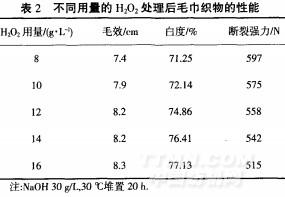 这些基团除与色素反应外,也能氧化浆料、胶质等,使毛效也随之增加,但这种氧化作用也会作用于纤维上,特别是在碱用量较高的条件下,所造成的损伤更大.综合考虑,双氧水用量在12~l4g/L时较好.