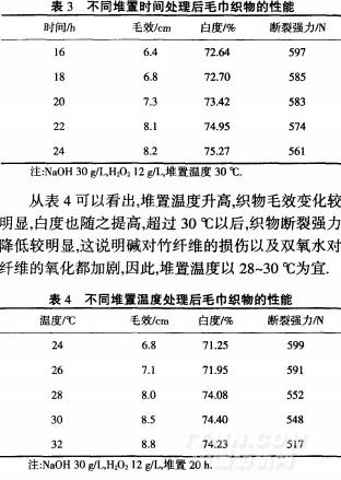 从表3可以看出,堆置时间延长可以提高织物的毛效和白度,但提高幅度较缓,22h后,织物的毛效和白度变化不太明显,断裂强力会有一定程度的降低.因此,堆置时间不宜过久,选择20~22h较为合适.