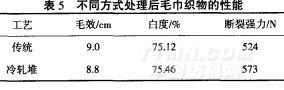 从表5可以看出,采用冷轧堆工艺处理的毛巾织物吸水性和白度同传统工艺相当,而织物受损情况却远远小于传统工艺.