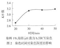 由图2可见,染料上染过程主要体现在前30 min,30 min后增幅缓慢,说明染色30 min的上染量基本达到平衡.故将染色时间定为30 min.
