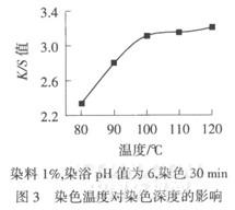 由图3可见,随着染色温度的升高,染色深度增加,100℃后染色深度增加不大,聚乳酸纤维玻璃化温度约70℃,高于此温度,染料才可能上染,原因是聚乳酸纤维结晶度高、自由体积少,需要高温才能形成足以使染料扩散进去的空隙;另外,染料分子在高温下能量增大,有利于扩散进入纤维内部.虽然温度越高,染色深度越大,但随着温度的升高,聚乳酸纤维在湿热条件下的水解程度增大,影响织物强力,所以,将染色温度定为100℃.