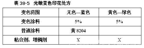 光敏变色印花的工艺流程基本上与涂料印花工艺流程相似:印花(100网目)--烘干(100℃)--低温焙烘(120℃,5分)。