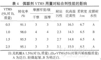 (2)D4+VTMS用量5%(对聚丙烯酸酯质量)反应,其中VTMS用量1.0%(对D4质量),有助于提高膜的耐水性及其与纤维的粘结力.