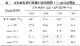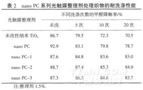 由表2可知,用未改性纳米Ti02或nano PC处理的织物洗涤后,其降解VOC的能力下降,且洗涤次数越多,下降幅度越大,而加入交联剂后,光触媒剂(如nano PC-1、nano PC-2和nano PC-3)由于改性或通过交联剂的作用能使光触媒剂交联或接枝到纤维上,形成共价键结合,提高了纤维与整理剂的结合牢度,使得织物降解VOC的耐洗性有较大幅度的提高,经20次洗涤后,其降解VOC的能力无明显下降,因此,经该整理剂处理后织物可获得较持久的光催化效果.