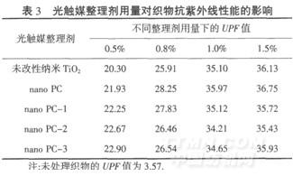 由表3可知,随着整理剂用量增加,抗紫外线能力提高;1.0%后,抗紫外线能力(UPF值)可超过35,比未处理织物提高了8倍多.