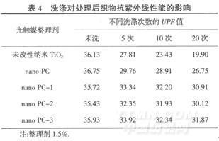 由表4可知,未改性纳米Ti02处理的织物洗涤后,其抗紫外线能力显著下降,且洗涤次数越多,下降幅度越大.而经过nano PC系列光触媒整理剂处理的织物,尤其是与交联剂复合的整理剂(如nano PC-1、nanoPC-2和nano PC-3),由于其与纤维发生了共价键的接枝或交联反应,提高了纤维与整理剂的结合牢度[10],使得织物的耐洗性有较大幅度提高,洗涤20次后,其抗紫外线能力仍能保持较高值.