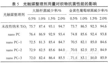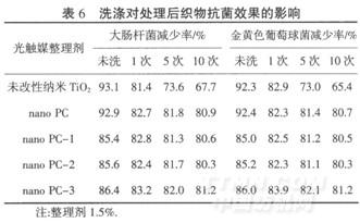 由表6可知,未改性纳米Ti02处理的织物,洗涤后抗菌效果明显下降,且洗涤次数越多,下降程度越大.而nano PC系列光触媒整理剂处理织物时,尤其是nano PC-1、nano PC-2和nano PC-3整理剂,尽管在相同整理剂用量情况下,处理后织物的抗菌效率稍低,但因交联剂的存在,与纤维发生了共价键的接枝或交联反应,提高了纤维与整理剂的结合牢度,使得处理后织物的耐洗性提高,洗涤10次后,其抗菌性能仍能保持原有的水平.