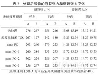 由表7可以看出,未经紫外线照射的各类纳米整理剂处理后的织物,在短时间内的断裂强力和撕破强力与未经整理的织物比较,部分稍有下降或提高,但变化不大.而不同纳米光触媒整理剂整理后的织物经紫外线照射一段时间后,则出现很大的差异:未改性的纳米Ti02处理后的织物,经紫外线照射48 h后,其断裂强力和撕破强力的下降幅度大于nano PC系列纳米光触媒整理剂处理后的织物;而用nano PC系列纳米光触媒整理剂处理后的织物,经紫外线照射后,其断裂强力和撕破强力的下降差值低于用未改性的纳米Ti02处理的织物,原因是改性纳米Ti02表面存在的硅氧键等基团,可以隔离纳米Ti02与纤维的直接接触,对纤维有一定的保护作用,利用本文开发的系列改性纳米Ti02光触媒剂使Tioz对纤维的光氧化作用降低.可以擗龟或降低纤维的劣化觋象.