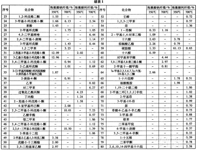 海藻酸钠和海藻酸钙纤维在 3 5 0 ℃和7 5 0 ℃时的气相裂解产物列示于表 1 。