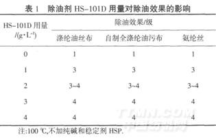 从表1看出,随着除油剂HS-101D用量的增加,除油效果增强,3 g/L时,除油效果较空白提高了3级,说明除油剂HS-101D本身对织物油渍乳化及分散作用好,无需借助碱剂对油渍分解即可发挥除油作用,继续增加用量,除油效果增加不明显.