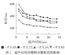 由图1可知,随超声时间延长,颜料粒径逐渐减小,10min后,粒径减小趋势变缓.30min时,P.Y.14和P.Y.83的粒径比P.Y.65和P.Y.73小.原因是P.Y.14和P.Y.83结构中带有更多的羧基和甲氧基,有利于颜料分散于水中.