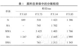 从表l可知,颜料在苯乙烯中的粒径比较小,原因是在颜料结构中含有苯环,与同样具有苯环的苯乙烯之间存在一定的相互作用力,而丙烯酸酯类单体结构中没有苯环,与颜料之间的相互作用力很弱,颜料在丙烯酸酯类单体中较难分散,大体上分散粒径大于颜料在苯乙烯中的分散粒径.