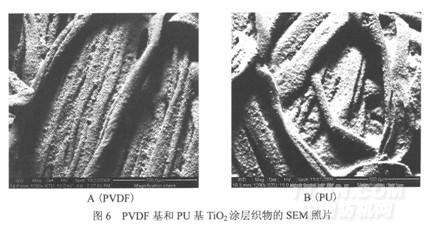 图6为PVDF基和PU基Ti02涂层织物的SEM照片