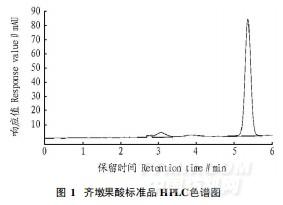 2.1.1线性关系。由图1可知,齐墩果酸标准品在5~6min出峰,计算得回归方程为y=24208x-126.8,r=0.9991。结果表明,齐墩果酸在0.2052~1.0260mg/ml范围内与峰面积呈良好的线性关系。