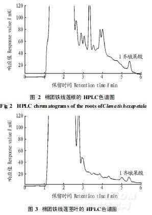 1.2.4样品含量测定。分别取棉团铁线莲根、茎叶供试品溶液进行HPLC测定,进样量均为10,l平行进样3次,计算齐墩果酸含量。