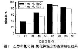 由图6可见,氯化钠、氯化钾和硫氰酸钾在解吸中效果相当,无机盐浓度高则解吸效果稍好。但硫氰酸钾溶于水后会污染水体,故不采用。乙醇解吸效果好于甲醇,故进一步研究乙醇和氯化钠、乙醇和氯化钾混合溶液的解吸效果。图7为各含有1mol/L氯化钠和氯化钾的乙醇溶液的解吸效果。
