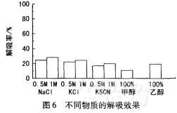 从工业角度考虑,吸附材料能够满足吸附一解吸多次应用过程才能降低污水处理成本。因此对阳离子交换膜进行解吸试验,主要研究了无机盐氯化钠、氯化钾、硫氰酸钾(浓度分别为0.5mol/L和1mol/L),以及有机溶剂甲醇、乙醇的解吸效果,解吸温度为25℃,pH值7,时间20min,见图6。