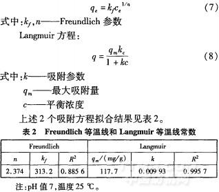 在吸附平衡研究中,描述吸附等温线最常用的表达式是Freundlich方程和Langmuir方程。Freundlich方程: