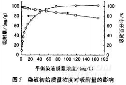 由图5可知,随着初始染料质量浓度的增加吸附百分率有所下降,在初始质量浓度为400mg/L后下降明显。这是该阳离子交换膜对该染料吸附达到平衡的缘故。