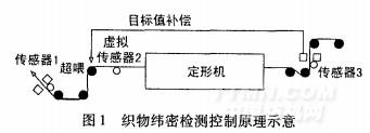 具体使用时,可在定形机前后各安装一个传感器来控制超喂装置,使织物纬密达到最佳状态。准确控制织物纬密或线圈数,可保证织物的定形效果和缩率的稳定性。即使织物纬密出现经常性变化,也可以根据实际值与目标值间的差异在机器进布区适当调整超喂量,并可在出布区再次对织物纬密进行检测,将检测结果反馈至进布区进行预先调整。织物纬密检测示意见图1。