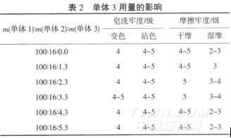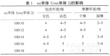 其它条件不变时,改变单体配比,所合成的固色剂固色效果如表1所示.