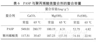相对分子质量分布很宽,从一千到数十万不等唑在纺织工业上一般应用相对分子质量15000以下的, PASP的半致死量LD50≥10 g/kg,无毒性,易生物降解,对环境无污染,是一类绿色螯合剂,对Caz+有优良的螯合性能,但是对Mg2+、Fe3+的螯合能力较弱,单独使用存在一定局限性,通过合理复配,可以发挥2种螯合剂之间的协同作用.例如:利用PASP对Ca2+有很强的螯合能力,而聚丙烯酸类螯合分散剂对Caz+的螯合能力最弱;对Mg2+、Fe3+的螯合能力PASP很弱,聚丙烯酸类螯合分散剂则很强,因此将这2种螯合剂以一定比例复配后,两者取长补短,充分发挥复配增效作用,对Ca2+、Mg2+、Fe3+具有综合性能,具有良好的阻垢作用.温度升高螯合容量都下降(如表6所示),复配后的螯合剂也产生相同效应.