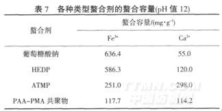 表7中所示各种螯合剂的螯合容量,葡萄糖酸钠和HEDP对Fe3+的螯合能力特别强,但是对于Ca2+的螯合能力特别弱;ATMP对Fe3+和Ca2+的螯合能力很均衡而一般;PAA-PMA共聚物对Fe3+和Ca2+都较差,但具有分散能力,