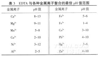 螯合剂与金属离子形成螯合物,在不同的pH值情况下,其络合稳定常数是不同的.所以,选用螯合剂最重要的因素是要考虑溶液的pH值,同一个螯合剂在不同pH值时其螯合性能完全不同.例如EDTA在pH<3时几乎不能将Ca2+、Mg2+螯合,而对Fe3+、Cu2+,即使pH值为1时,仍能定量地进行螯合反应.而pH>12时,EDTA失去络合能力(Ca2+除外).表3为各种金属离子被EDTA螯合的最佳pH值范围.Ca2+、Mg2+在碱性条件下进行螯合,Fe3+在酸性条件下进行螯合,Cu2+较广的pH值范围内螯合,每一个螯合剂对金属离子螯合都有最适宜的pH值范围.