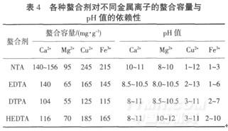 溶液的pH值对螯合容量也有影响,表4为螯合剂的螯合容量与pH值的依赖性(对不同金属的最适宜pH值范围内的螯合容量).