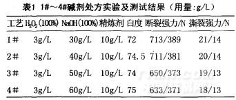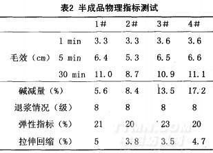 通过分析表1可知:1#~4#工艺处理的半成品白度基本差不多,强力损失程度1#工艺最小,断裂强力、撕裂强力都比较高,效果最佳,4#工艺烧碱用量增多,但整体指标合格。