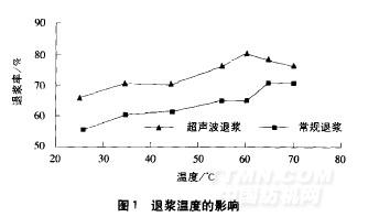 在超声波及常规方法下用BF一7658淀粉酶(49IL)对棉织物处理巧min不同温度下所得织物退浆率见图1。