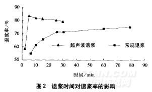 在温度为60℃的条件下.分别在超声波作用和常规方法下用BF一7658淀粉酶(4g/L)对棉织物进行退浆,不同处理时间下所得织物退浆情况见图2。