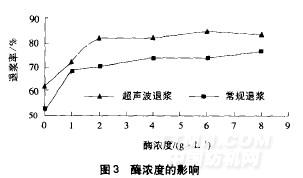 由图3可知在超声波和常规方法下,退浆率随酶浓度的增加而增加超声波退浆效果优于常规退浆。从曲线上可以看出.超声波退浆时酶浓度以29/L为宜而常规退浆时酶浓度要49/L产生这种差距的原因是超声波空化而引起的分散作用可以使大分子之间产生分离促进浆料与粘着变松.并且超声波能够促进退浆液与浆料充分接触,由此可见超声波辐射作用可以减少退浆剂的用量。
