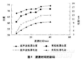 按上述优化选择的超声波退浆工艺(酶29/L温度60℃.时间5min)和常规退浆工艺(酶4glL.温度60℃时间30min)对棉织物进行退浆处理然后在60℃下浸溃4g/L30%双氧水然后在95一l00℃时汽蒸30min,图4是不同浸溃时间下织物的毛效和白度。