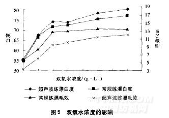 双氧水浓度对漂白效果的影响见图5。从图5可知.在超声波环境下和常规方法下织物的白度和毛效都随双氧水浓度的增加而增加,超声波对漂白效果的影响大于常规方法但超声波对毛效的影响比白度更明显。超声波练漂时(上接P96)的高低选择相应整理剂,如出口美国的产品可选用OLEOPH一OBOLOCO整理剂出口欧洲产品可用RUCO一GuARDAFR整理剂出口亚洲地区或国内市场的面料可选用AsAHIGuARDAG一480整理剂。上述3种整理剂对于用士林染料染色的中浅色全棉布,色光影响不大在双氧水浓度超过49/L以后毛效增加缓慢,因为此时织物上杂质已基本去除再增加双氧水浓度只会降低织物强度。