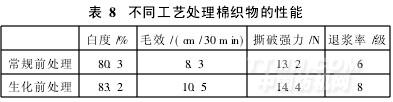 从表8可以看出,与常规工艺相比,采用连续式生化前处理工艺,织物的各项指标均有提高,毛效提高25%以上,撕破强力提高9%,退浆率提高2级。