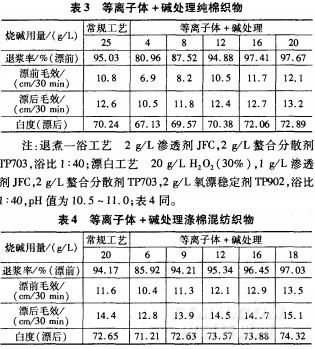 从表3、4可以看出,纯棉和涤棉混纺织物经等离子体处理后,再用少量的烧碱处理就可以获得比较好的白度、毛效以及退浆率。对于纯棉织物,常规煮练工艺需要25g/L烧碱才能达到的效果,采用等离子体预处理,碱用量只需要l2~l5g/L;对于涤棉混纺织物,常规工艺烧碱用量要20g/L左右,等离子体处理后烧碱用量只需要9~l0g/L。