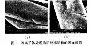 与传统的碱退浆、煮练工艺相比,生物酶前处理具有强力损失小、手感好、节约能源以及对环境友好的优点。但是,生物酶价格较贵,在织物质量指标诸如毛效、白度、退浆率等方面,也与传统烧碱处理存在一定的差距。因此,如果采用等离子体与酶联合工艺,在印染厂生产过程中不但可以在退煮工艺中完全不用碱;更可以提高纺织品处理质量(诸如减小强力损失,提高柔软度等)。