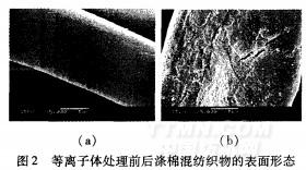 由图1和图2可以看出,未经处理的纯棉和涤棉混纺织物,纤维表面完全被浆料包覆;经等离子体处理后,纤维表面的浆料出现了凹坑和裂纹,有利于烧碱或生物酶渗入,并快速溶胀分解浆料。因此,经等离子体处理后的棉及涤棉混纺织物,采用较低的化学品浓度就可能达到前处理工艺的要求。