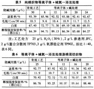 如果要进行后续染色、印花加工的产品,对前处理半制品的质量要汞不是很高,则等离子体预处理后,可以考虑用碱氧一浴法工艺来继续对织物进行前处理,从而节省成本,提高效益。