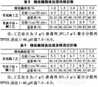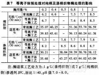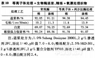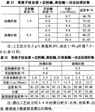从表lO可以看出,对于两步法工艺,无论是单独的生物酶工艺还是等离子体结合生物酶工艺,都基本可以满足后续生产的要求,且后者无论是毛效、退浆率、白度还是断裂强力保留率,都优于单独的生物酶处理工艺。